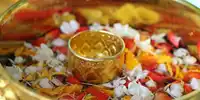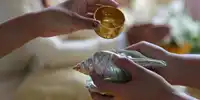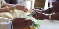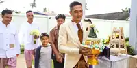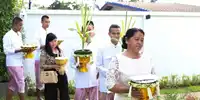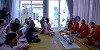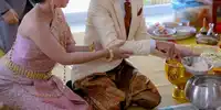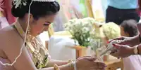 The wedding day morning in Bang Jo, the bride and groom and all guests were marching solemnly into the villa. Later on monks arrived to the villa, to visit the couple. The monks made their prayers whilst a lit candle was placed in a bowl of water. This lustral water was then used to bless the couple. A bowl of white paste then blessed the foreheads of the bride and groom.
