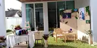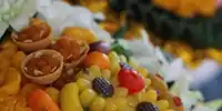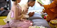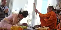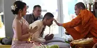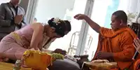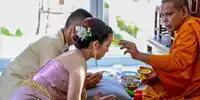 The wedding couple and their relatives offer food to the monks before leaving the room to allow the monks to eat. Nobody else is permitted to eat until the monks have finished their meal. After their meal, the monks began their chants again, and the senior monk blessed the couple, and everybody present, with holy water. The monks then returned to the temple. And left the wedding couple and all guests to celebrate in the atmosphere they had created themselves by decorating the villa, with pictures, flowers and colors in a costume unique to this wedding weekend.
